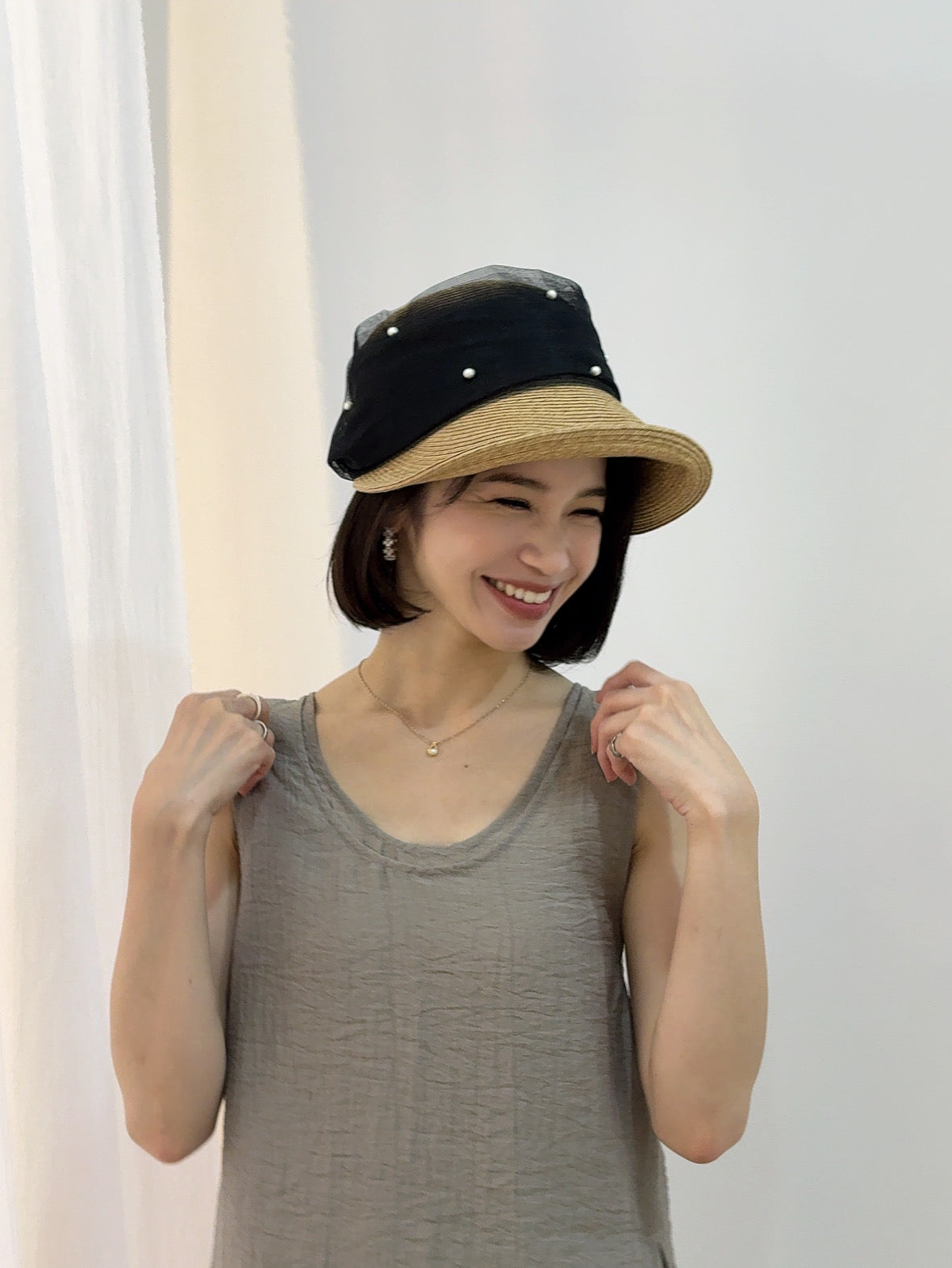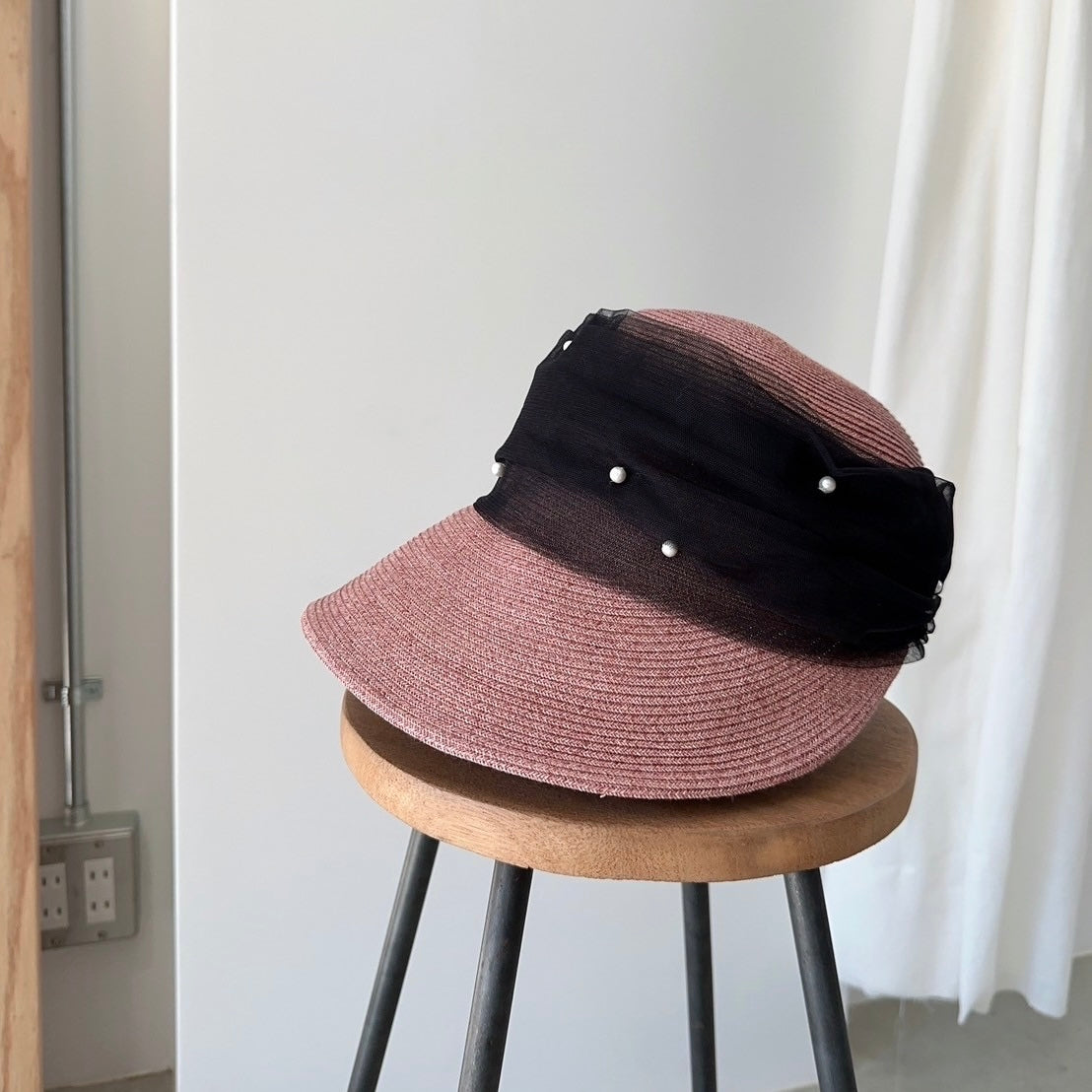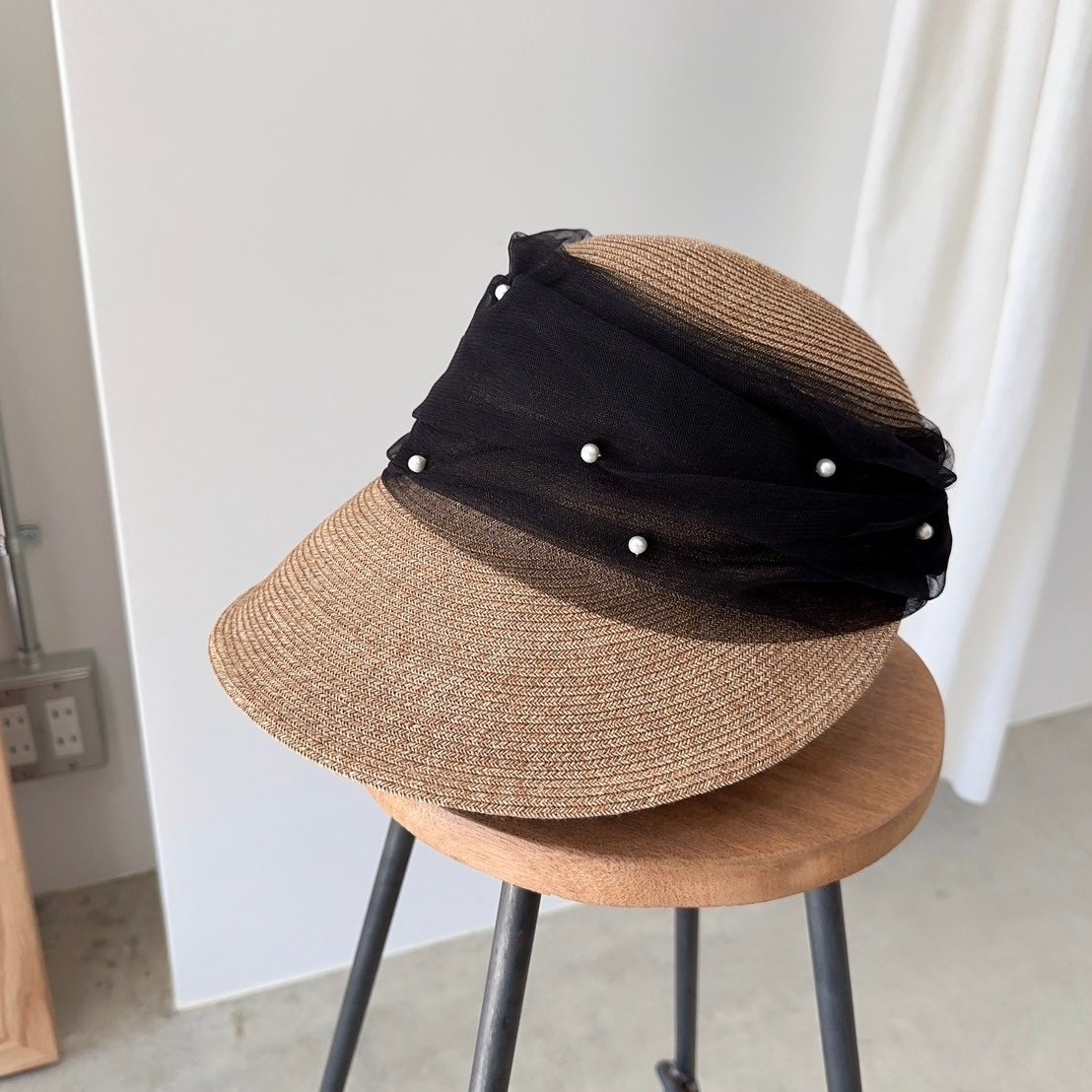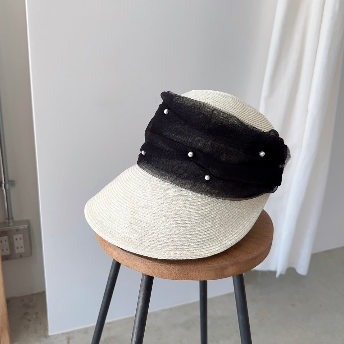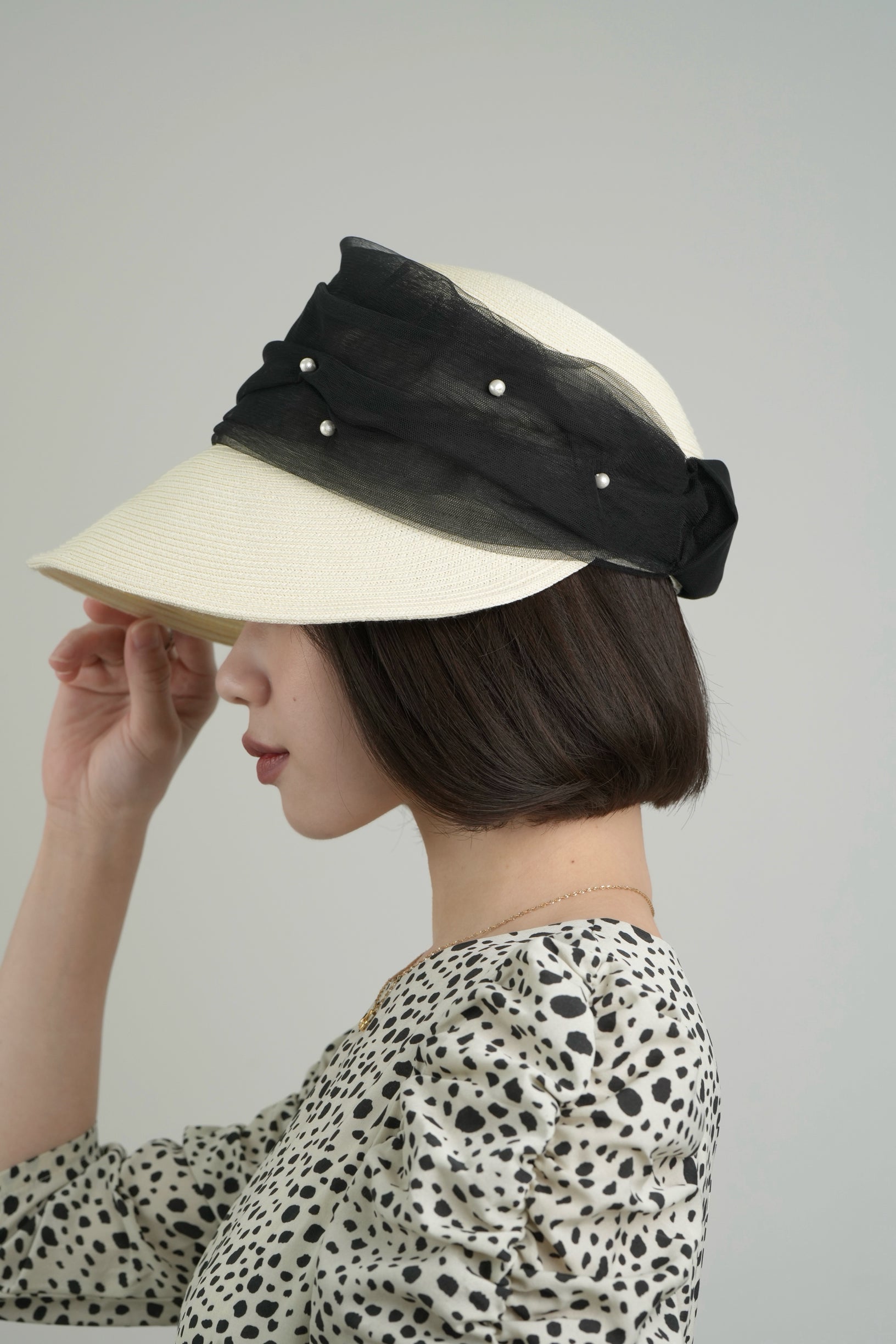 パールとチュールの装飾が特徴で、エレガントな雰囲気を演出。シンプルながらも洗練されたデザインで、どんなスタイルにも合わせやすい。